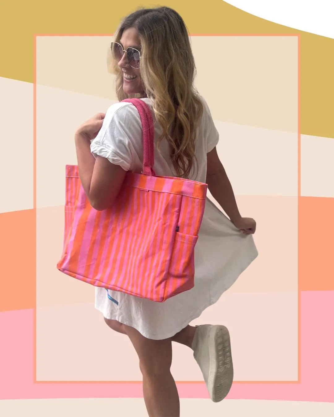 Carry your essentials in style with our personalized striped tote bag, designed for everyday use and special occasions. Made from durable fabric, this custom embroidered tote bag is both spacious and lightweight, making it the perfect choice for the beach, pool, travel, shopping, or school.